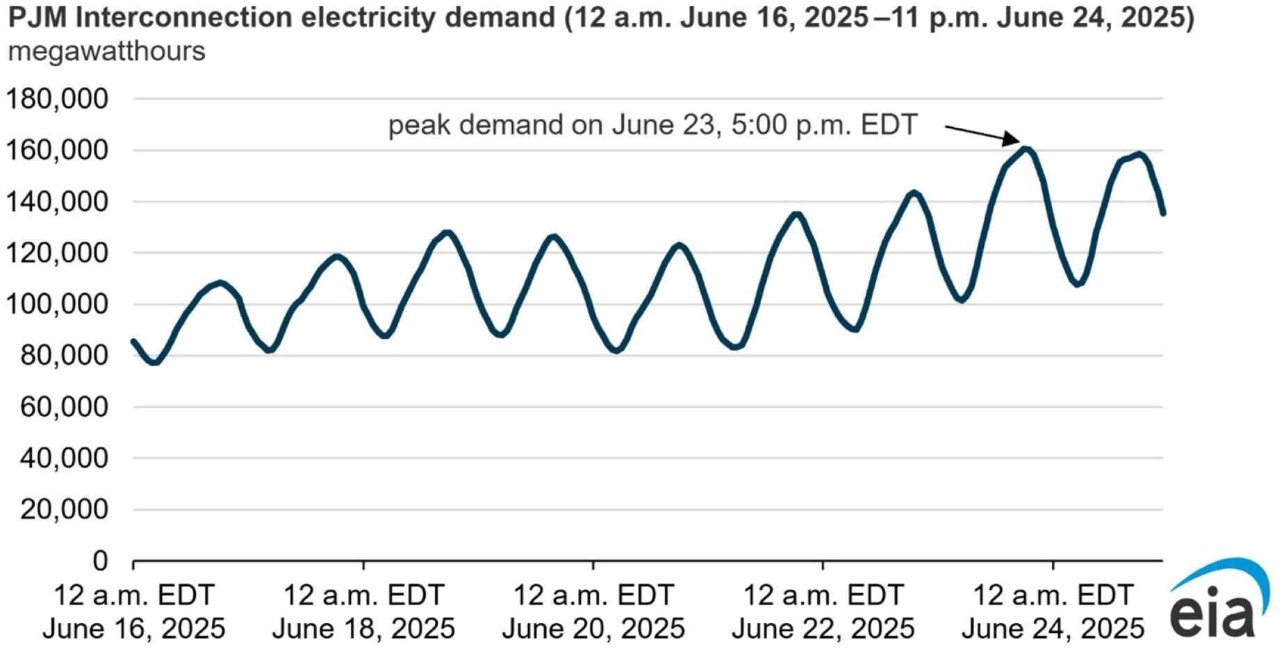The EIA’s Hourly Electric Grid Monitor shows the peak demand within PJM.