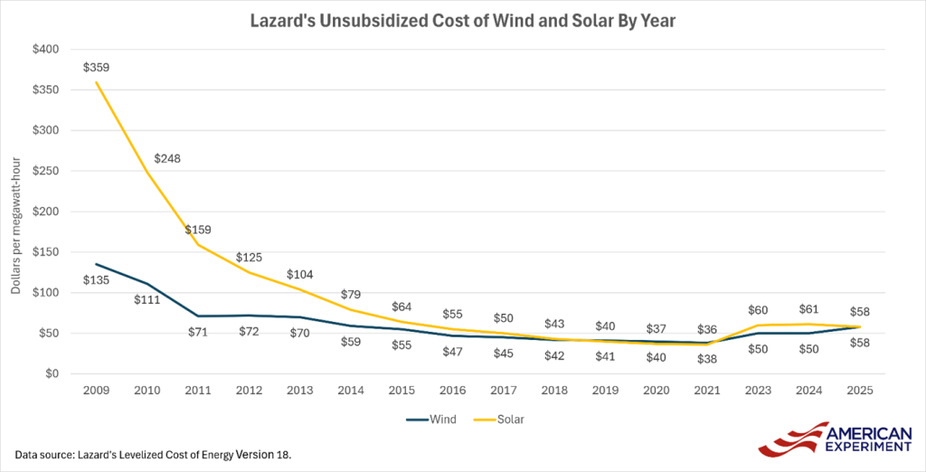 Mitch Rolling, former American Experiment policy fellow [and one of the Energy Bad Boys here on Substack], demonstrated in 2023 the unsubsidized cost of electricity from wind and solar in Minnesota from 2012 to 2023. Minnesota’s newest wind facilities now cost about $62.91 per MWh, up from $39.12 per MWh in 2019, or a 61 percent increase. New solar installations were even higher at $103.83/MWh in 2023, up 47 percent from $70.46/MWh in 2020.